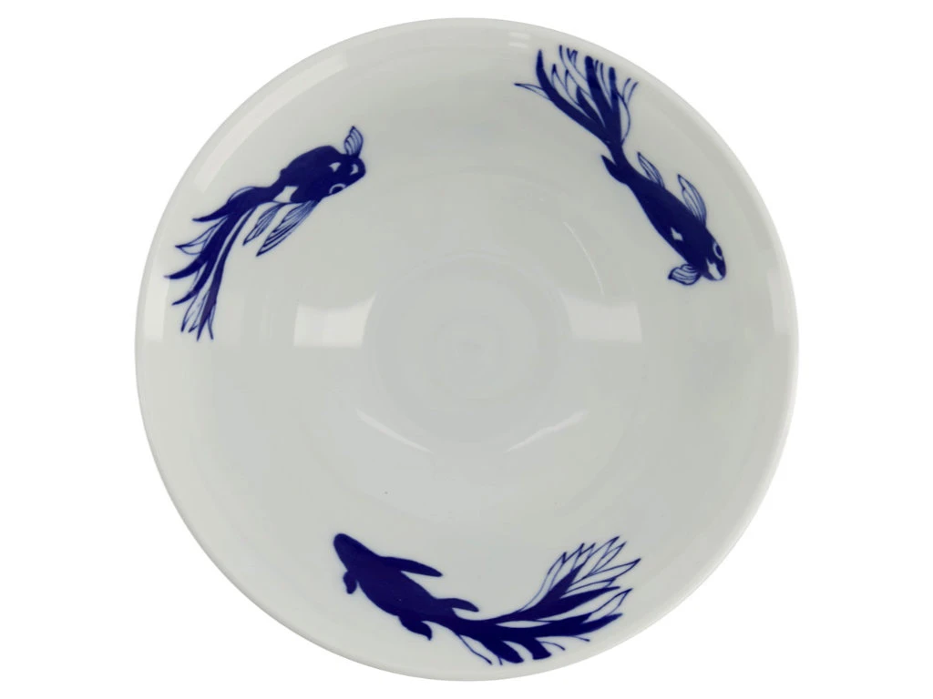 Le blanc laiteux typique de la porcelaine est subtilement rehaussé par l’ajout de ces quelkques poissons rouges, ici représentés en bleu pour une petite touche d’originalité.