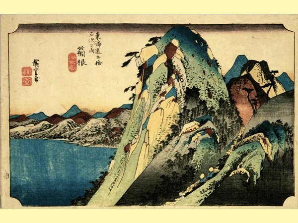 Nous vous proposons ici l’oeuvre intitulée « Hakone » : Connue aujourd’hui pour ses Onsen, Hakone était à l’époque déjà célèbre pour ses sources chaudes. Dans sa volonté de décrire la route du Tokaido, Hiroshige ne pouvait pas manquer de représenter ce lieu de passage incontournable.