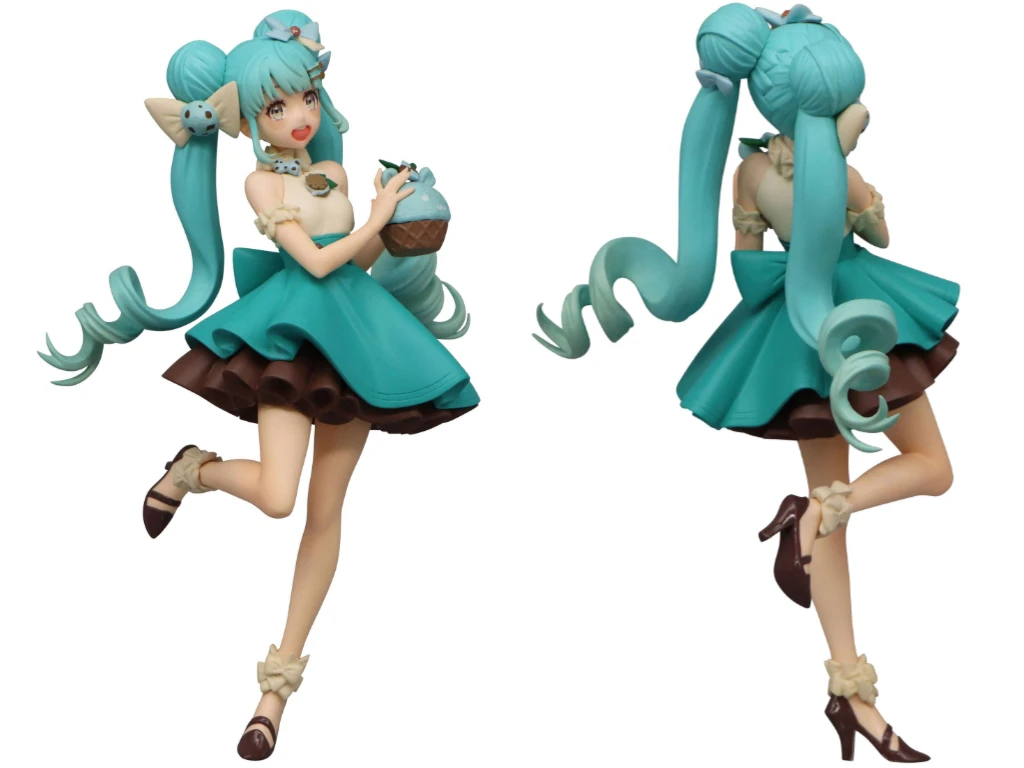 Issue d’une collection dédiée aux confiseries en tout genre, voici une nouvelle version de la star de Vocaloid, Hatsune Miku, dans des tons pastels sur des bases de brun et de vert pâle, à l’image des gâteaux associant chocolat et menthe.