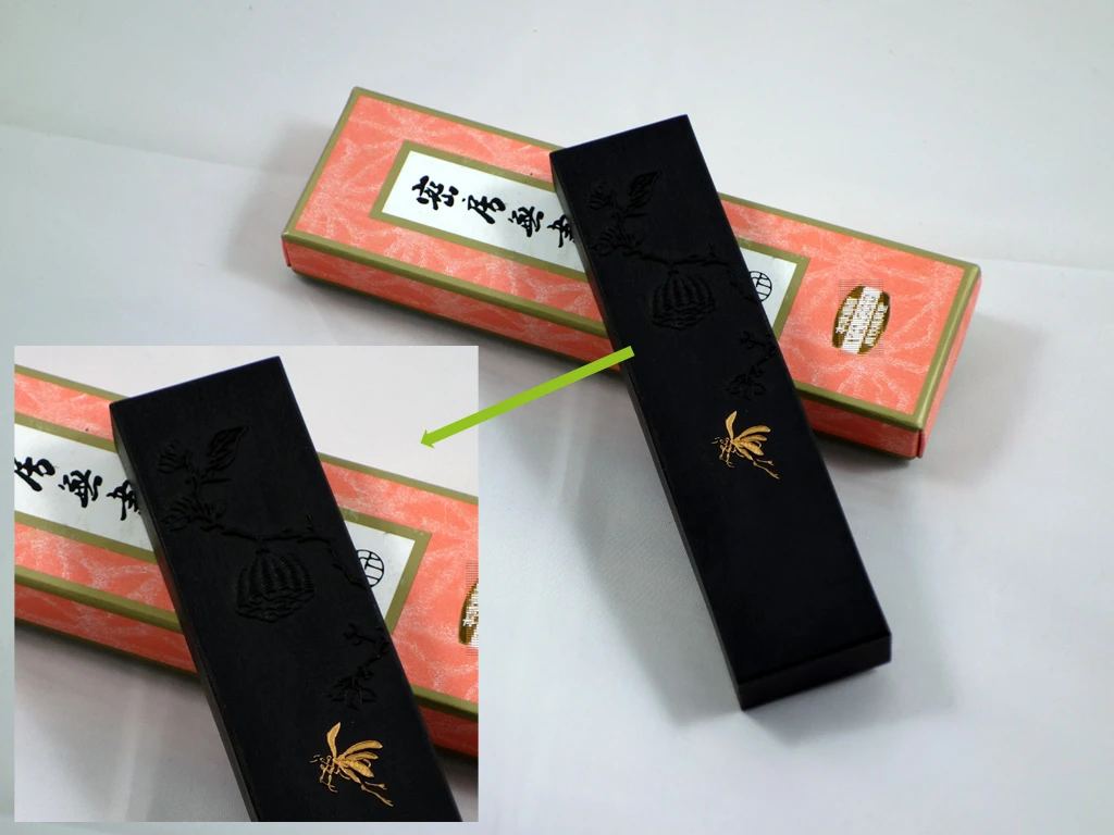 Konjaku vous propose ici une pierre de 75g aux dimensions de 12,7 x 3 x 1,5 cm environ, joliment décorée, comme le sont toujours les pierres d’encre de qualité au Japon.