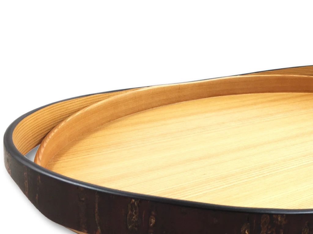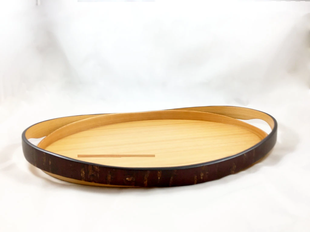 Les artisans de la maison Tomioka vous proposent par exemple ici un véritable chef d’oeuvre de leur savoir faire sous la forme d’un très beau plateau associant revêtement en kabazaiku pour les parties extérieures et surface en bois de cerisier afin d’apporter de la luminosité à celui-ci.