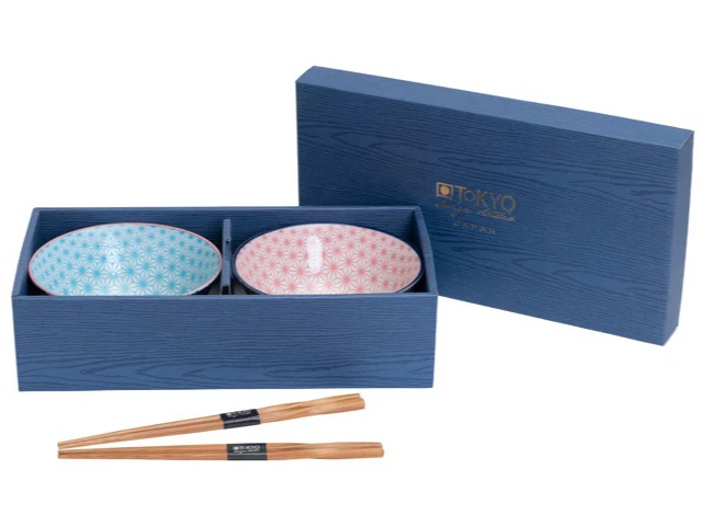 Le set comprend 2 bols de couleur différente, un bleu et un rouge/rose ainsi que deux paires de baguettes en bambou.