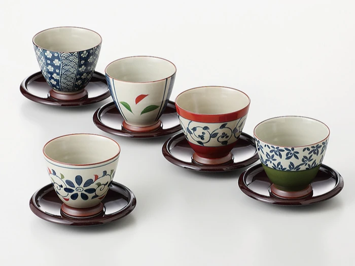 Comme le veut la tradition japonaise, ce service est constitué de 5 tasses (et non 6 comme en occident) de motifs variés mais complémentaires, et de leurs sous-tasses très sobres.